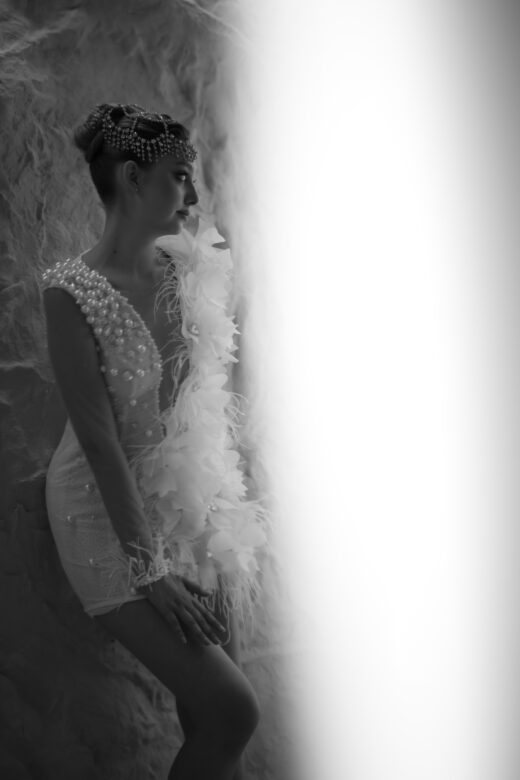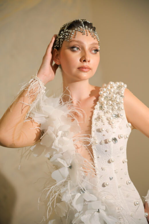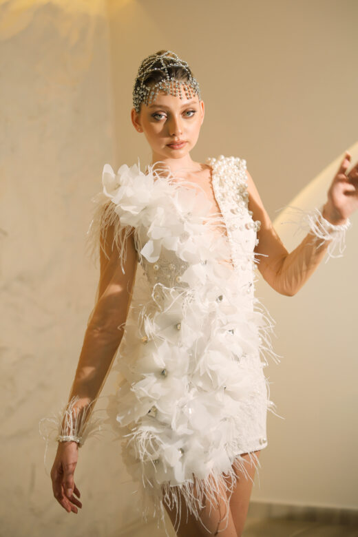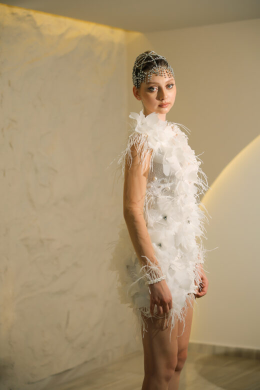 Arminia 3D Organze Çiçek Dantel -V Yaka Beyaz Mini Düğün Sonrası- After Party Elbisesi