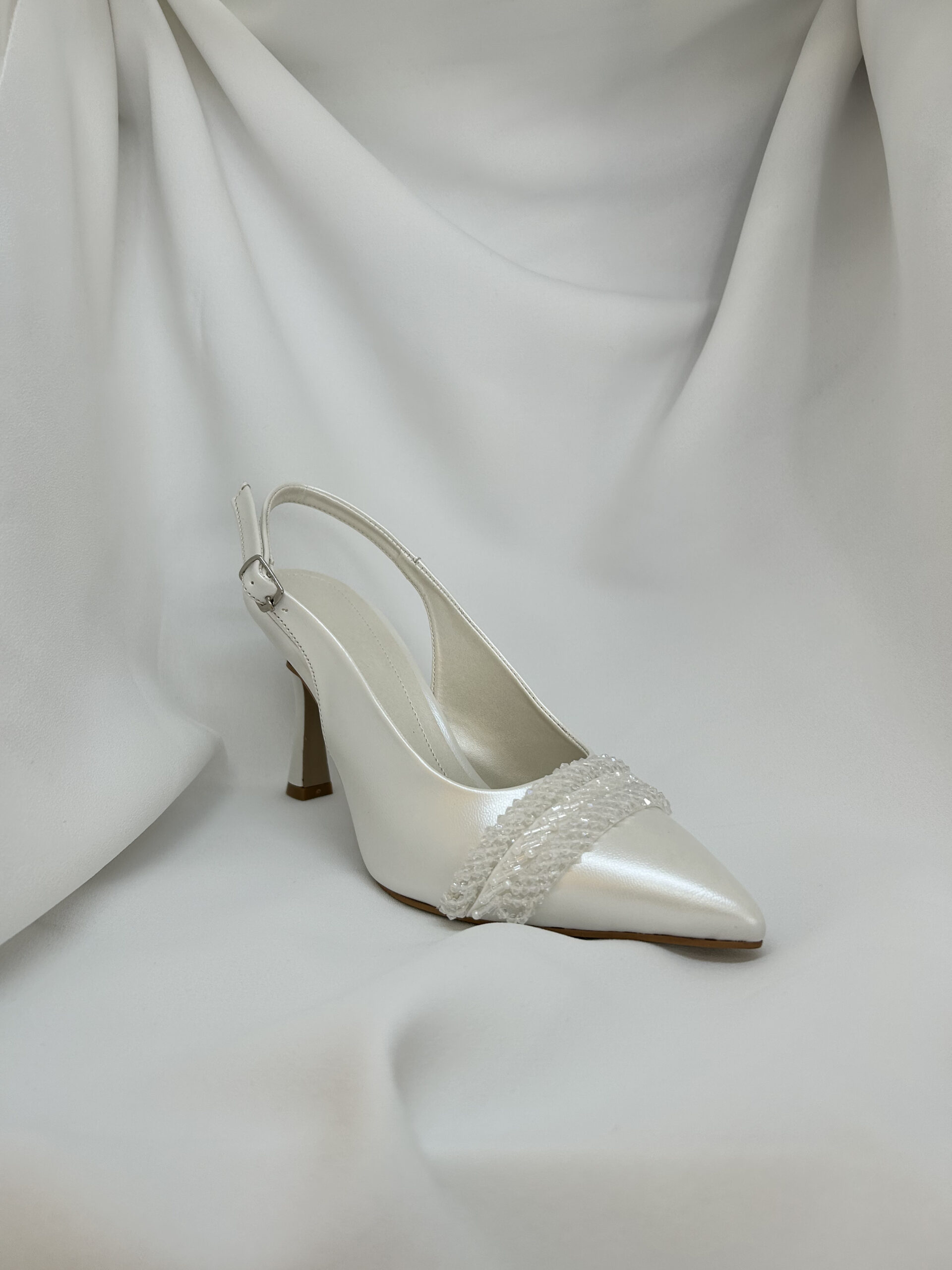 Zarafeti detaylarda arayan gelinlerimiz için tasarlanan bu slingback model, el işçiliği kristal boncuk detayları ve asil duruşuyla en özel gününüze eşlik etmeye hazır. İnce topuk ve sivri burun formunun inci beyazı ışıltısıyla buluştuğu bu model, tam bir “couture” eseridir.