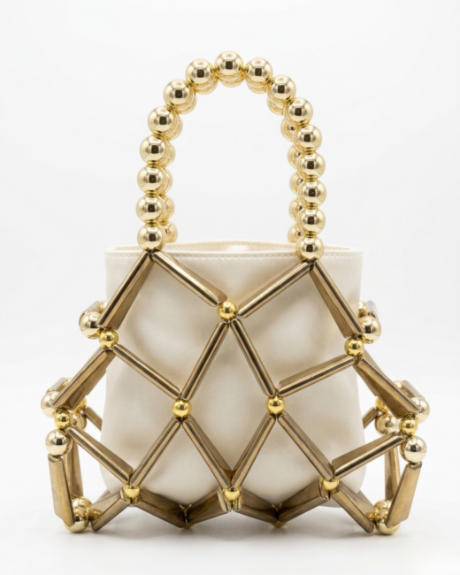 Modern Heykelsi İhtişam: Gold Çubuk Boncuklu Mimari Kafes Çanta