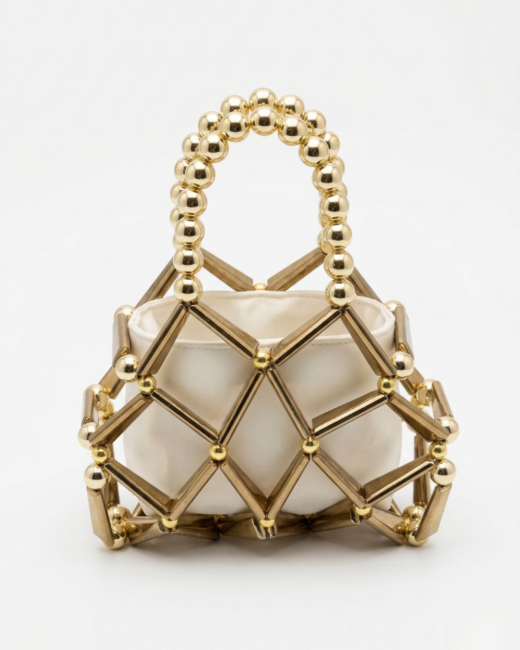 Sınırları zorlayan, modern ve iddialı bir tasarım… Altın rengi çubuk (boru) boncuklar ile yuvarlak boncukların kusursuz bir matematikle örülmesi sonucu ortaya çıkan bu mimari kafes çanta, adeta giyilebilir bir sanat eseri. Geniş baklava (elmas) desenli dış iskeleti ve iç kısmındaki zarif saten kesesi ile avangart bir şıklık sunuyor.